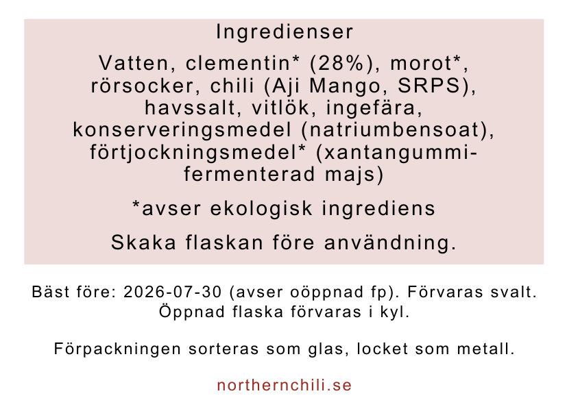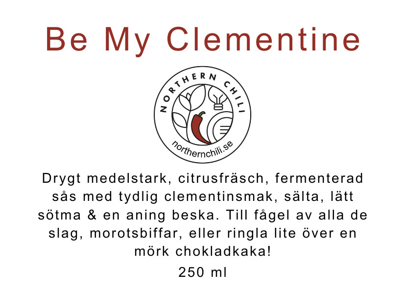Drygt medelstark, citrusfräsch, fermenterad sås med tydlig clementinsmak, sälta, lätt sötma & en aning beska. Till fågel av alla de slag, morotsbiffar, eller ringla lite över din kladdkaka. Förvånansvärt nog passar denna sås utmärkt till mörk choklad!