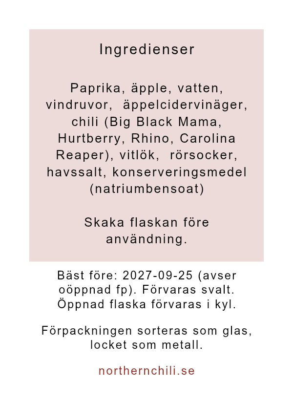 Ordentligt het sås med bland annat Hurtberry, Big Black Mama & Carolina Reaper. Smakprofilen påminner om en uppgraderad sriracha utan sötma. God till det mesta!