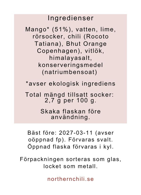 En explosion av ekologisk mango med en touch av lime & vitlök. God till fisk & skaldjur, tacos, linsbiffar, pizza, Asiatiska rätter, ljust kött & mycket mer! Testa!