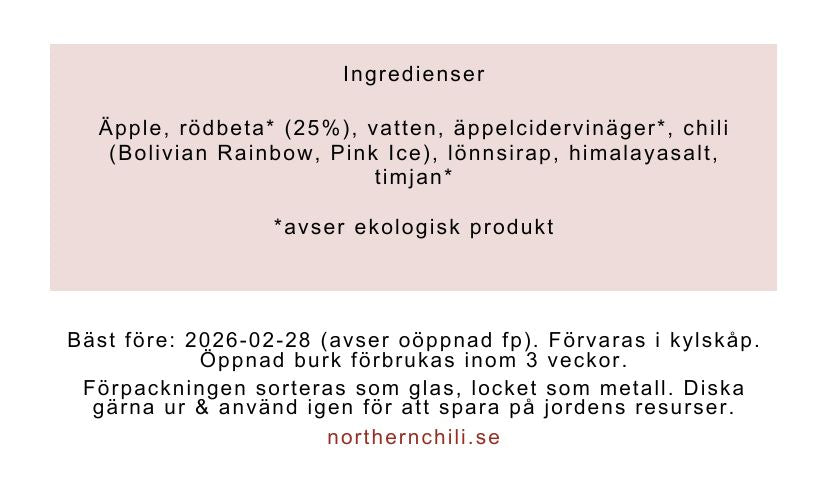 Äpplebaserad, bredbar röra baserad på främst svenska äpplen, grönsaker & örter. Denna spread innehåller rödbeta & timjan & har lite sting.