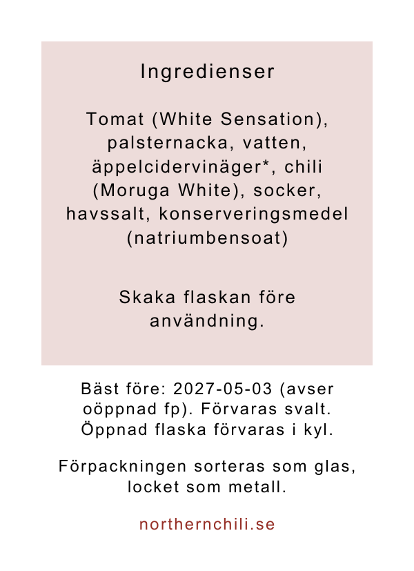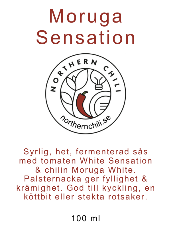 Syrlig, het, fermenterad sås med tomaten White Sensation & chilin Moruga White. Palsternacka ger fyllighet & krämighet. God till kyckling, en köttbit eller stekta rotsaker.